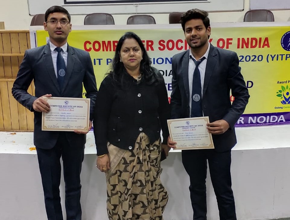 It is proud to announce that our students of BCA won special mention award in Regional Student Project contest on CSI STPI - YITP Awards 2020 -Region 1 on the theme - Smart Technologies for Digital India organized by Computer Society of India Ghaziabad chapter on 4th January, 2020 at Sharda University, Greater Noida. Students from various Universities, Engineering Institutes, Management Institutes from Northern India participated in the contest. Event was inaugurated by Mr Apoorva Agha , National Convener, CSI YITPA Awards. Dr Kavita Saxena, Dean Academics, SDCMT welcome all the guest as Chairperson, Ghaziabad Chapter. Around 35 teams participated in the contest.